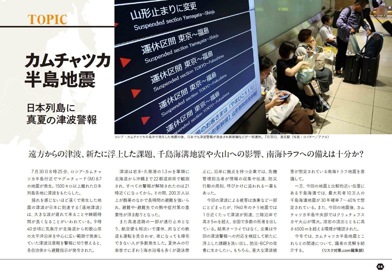 近年、日本の夏は大きく変わりました。「災害級」の猛暑が常態化するなか、危機対応はもはや日常。そこへ新たなハザードが襲えば、対応は自ずと複合化を迫られます。そのことを実感したのが、カムチャツカ半島地震の津波対応でした。浮上した課題を洗い出し、防災・BCPの改善に役立てたいところです。