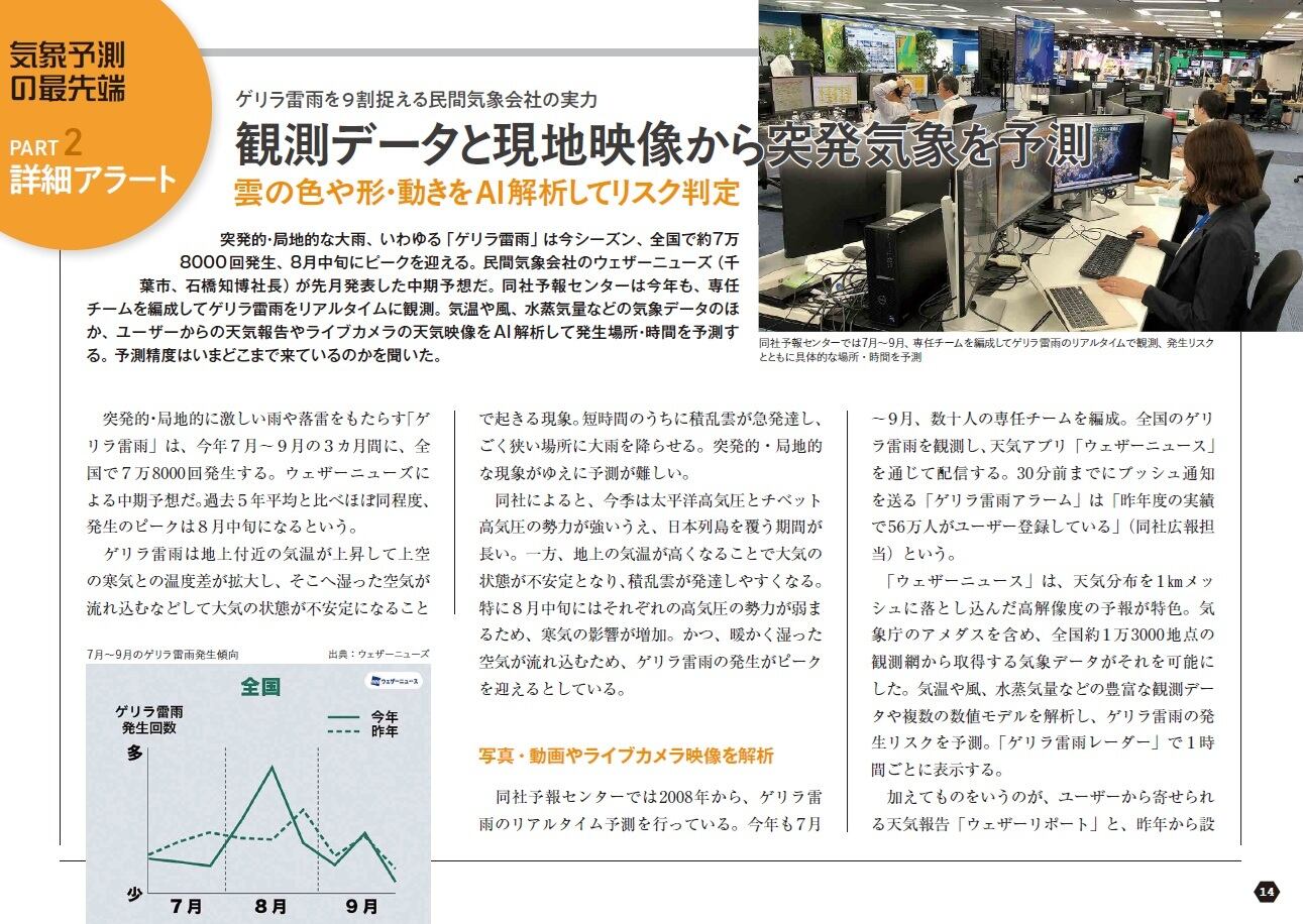 同時に気づかされるのは、日々の気象がいかに人の生活や活動に影響を与えているかということ。お盆休みの時期ですが、8月も暑さは衰えない見込みで、加えて台風が上陸しやすくなり、中旬頃にはゲリラ豪雨がピークを迎える予想もあります。危機管理担当者の方々は、気を抜けない日が続きそうです。