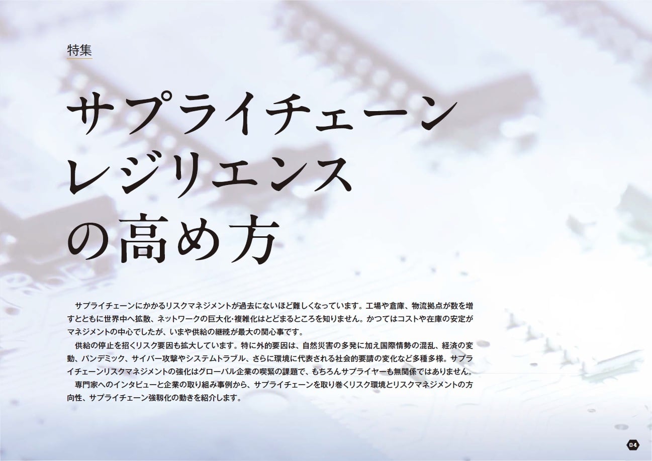 専門家へのインタビューと企業の取り組み事例から、サプライチェーンを取り巻くリスク環境とリスクマネジメントの方向性、サプライチェーン強靱化の動きを紹介します。
