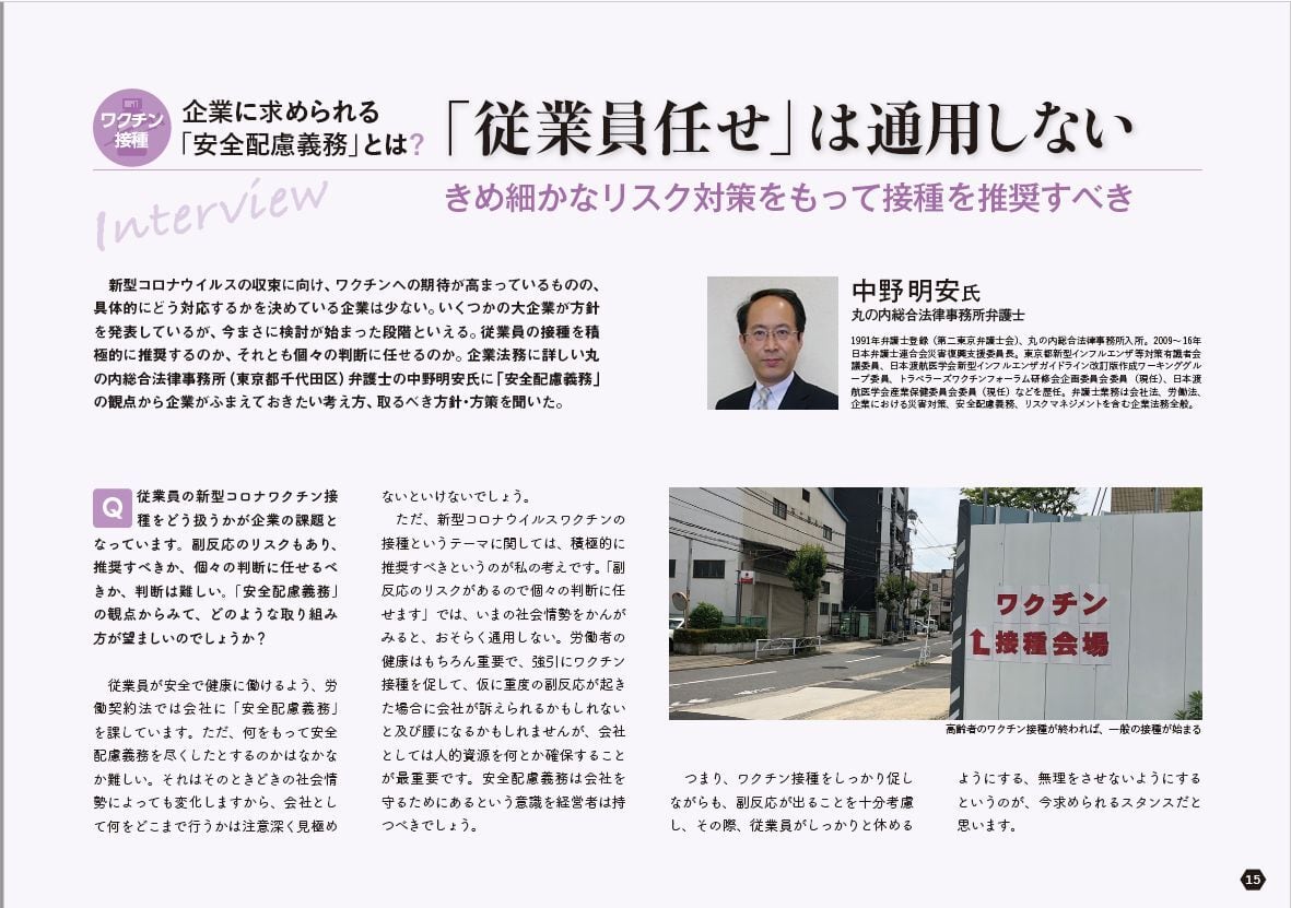 特に注目が集まるワクチン接種に関しては、従業員への対応方針を決めかねている企業が多いことをふまえ、経営判断として何が適切かを企業法務の専門家にインタビュー。接種を推奨すべきか任せるべきか、労働契約法の「安全配慮義務」の観点から聞きました。