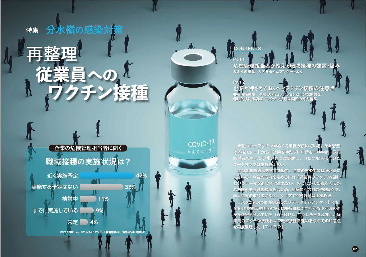 月刊BCPリーダーズ7月号は、企業のアフターコロナ戦略に影響を与える「従業員のワクチン接種」について、現時点での課題を再整理。危機管理担当者の不安や疑問を紹介するとともに、職域接種に取り組む際の注意点、会社の対応を検討する際の法務上の注意点をまとめました。