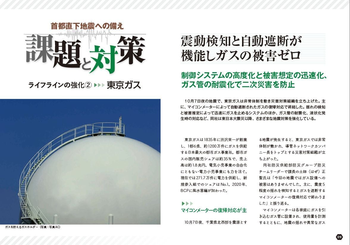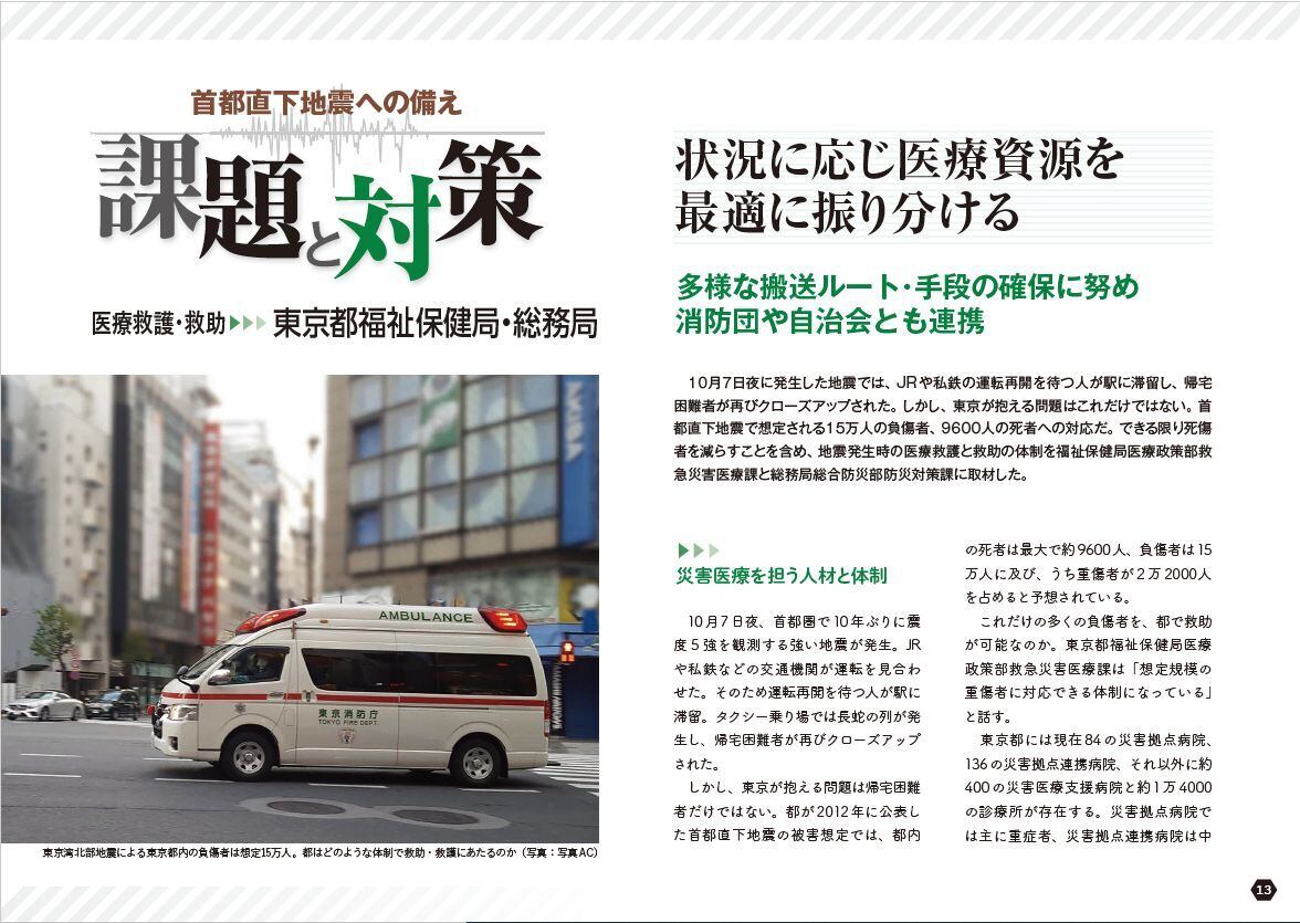 巨大な人口を抱える首都圏は、網の目のインフラによって便利な半面、それが止まるとたちまち自立生活ができず、二次被害も容易に起きかねません。検証すべき点はさまざまありますが、今号では東京都の水道、ガス、医療救護・救助の3つの供給体制について、地震対応を踏まえながら、課題と対策を取材しました。