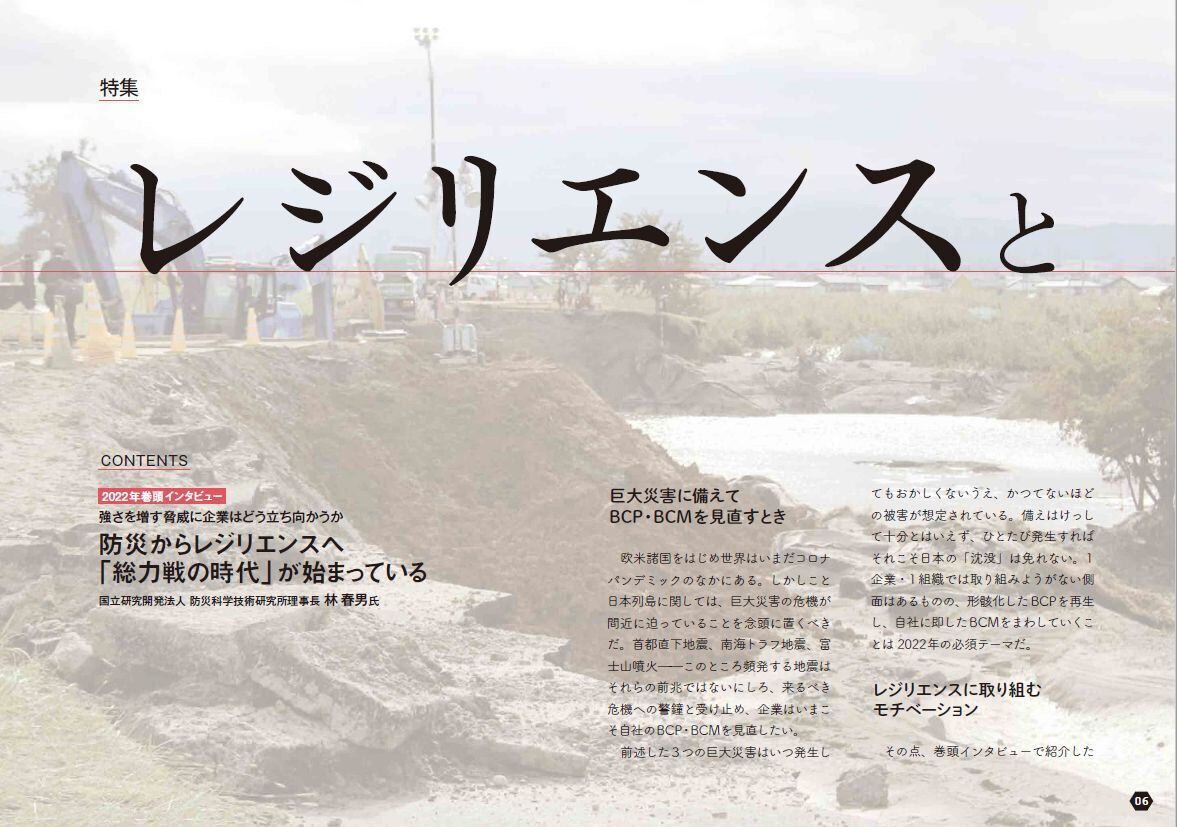 2022年年頭のインタビューは防災科学技術研究所の林春男理事長に登場いただき、昨年の災害を振り返りながら、日本社会の課題と企業が果たすべき役割、取り組みの方向性を語ってもらいました。すべての企業がレジリエンスに向けて手を打たなければこれからの危機を乗り越えられないという言葉は印象的で、BCP・BCMはまさに時代の要求といえそうです。