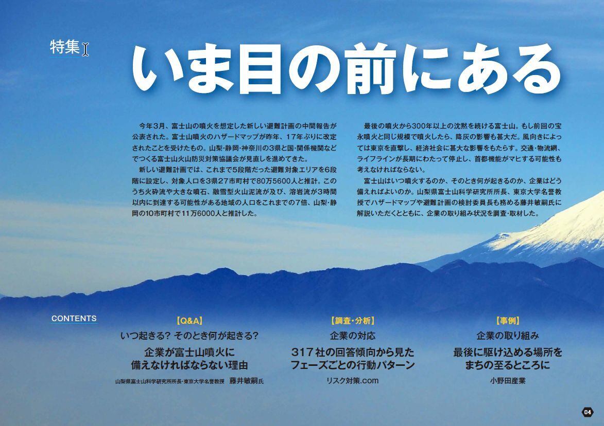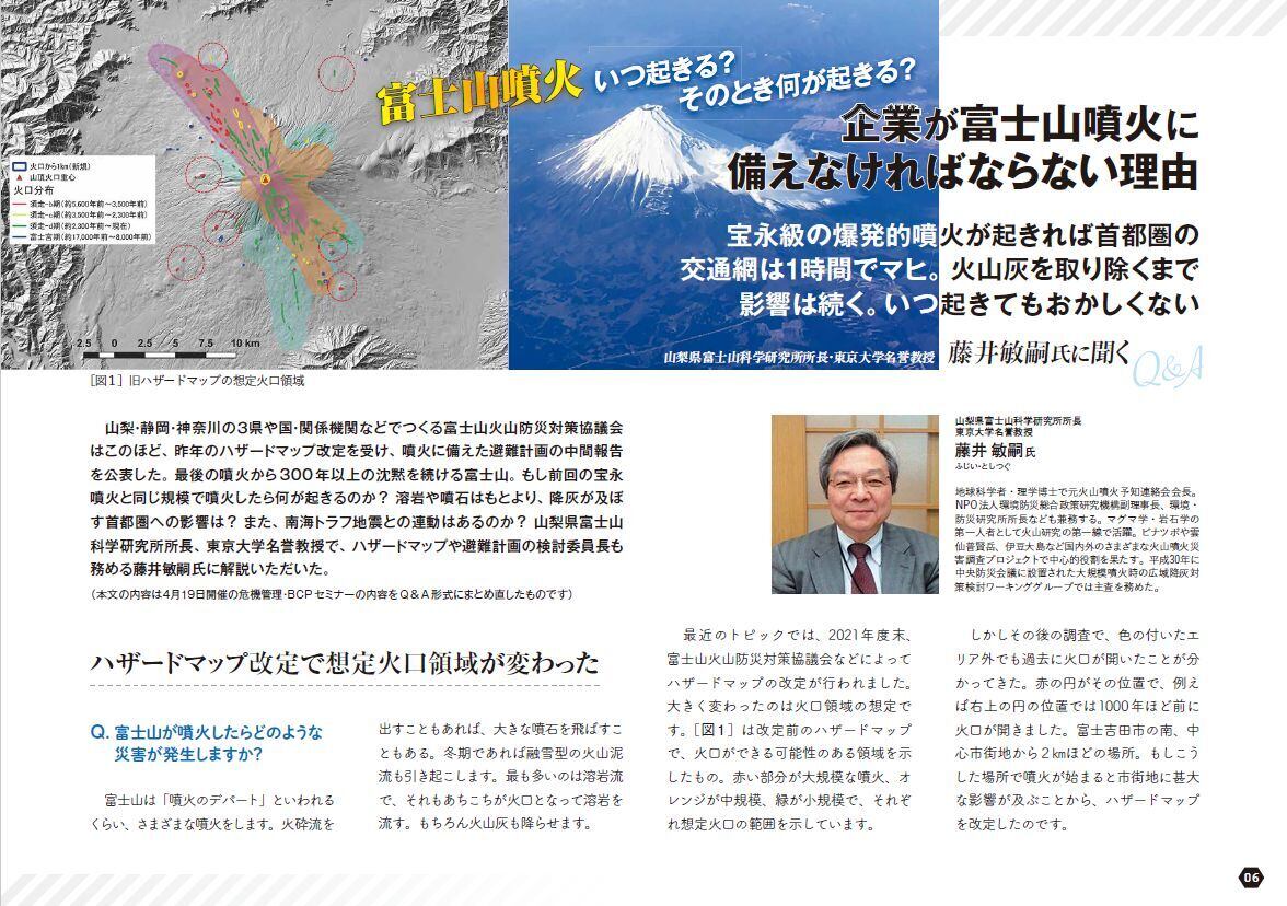 噴火は自然のサイクルとして必ず起きますが、富士山は最後の噴火から300年以上沈黙。もし前回の宝永噴火と同規模で噴火したら降灰による首都圏への影響も甚大です。それはいつか、そのとき何が起きるのか。山梨県富士山科学研究所所長の藤井敏嗣氏に解説いただくとともに、企業の備えと取り組みを調査、取材しました。