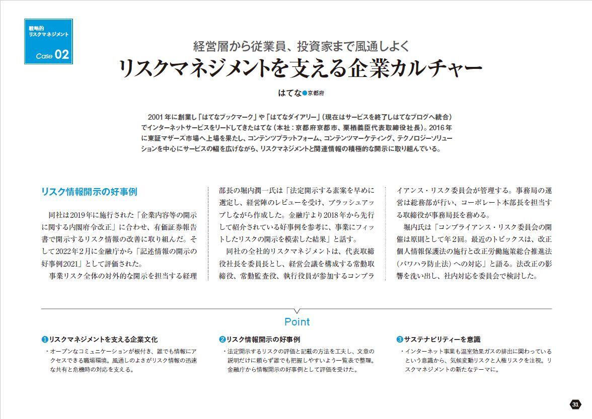 事例紹介は、リスクのマイナス面だけでなくプラス面にも光をあて、組織の積極的な成長につなげる「戦略的リスクマネジメント」にフォーカス。選定したリスク一つ一つの意味を全社的に深く解釈し理解を深めていく取り組みと、それを支える情報共有・開示の姿勢、風通しのよい組織運営は、パーパスドリブンな経営と重なります。
