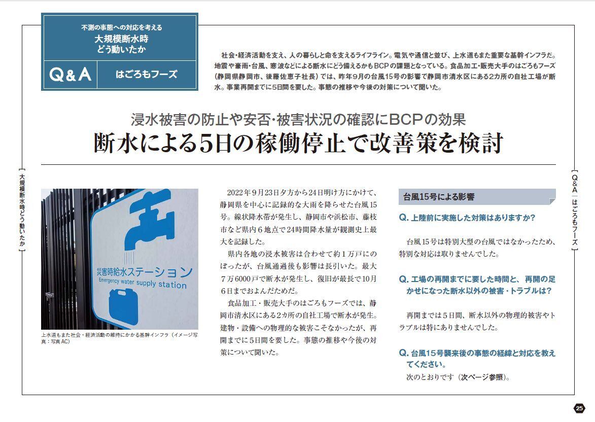 事例紹介は、不測の事態への備えと対応がテーマです。この1月は最強といわれる寒波により列島各地で交通網の混乱やライフラインの寸断が起きましたが、まさにBCPの真価が問われる場面。2016 年に突然の電源喪失に見舞われた病院の対応と、2022年に大規模断水に遭遇した食品加工メーカーの対応を紹介します。