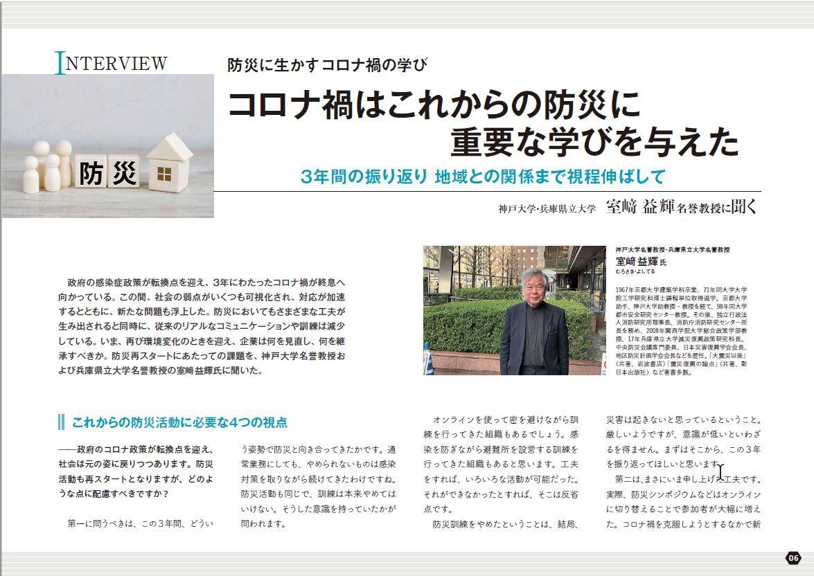 コロナ禍が終息に向かっているいま、防災も体制を見直して再始動です。この3年間、新たな工夫が生まれる一方、新たな課題も浮上しました。解決に向け多様な知恵が求められるなか、企業と地域の関係もあらためて注目されています。第1特集ではコロナ禍の学びを今後の防災にどう生かすか、企業と地域の関係はどうあるべきかを考えます。