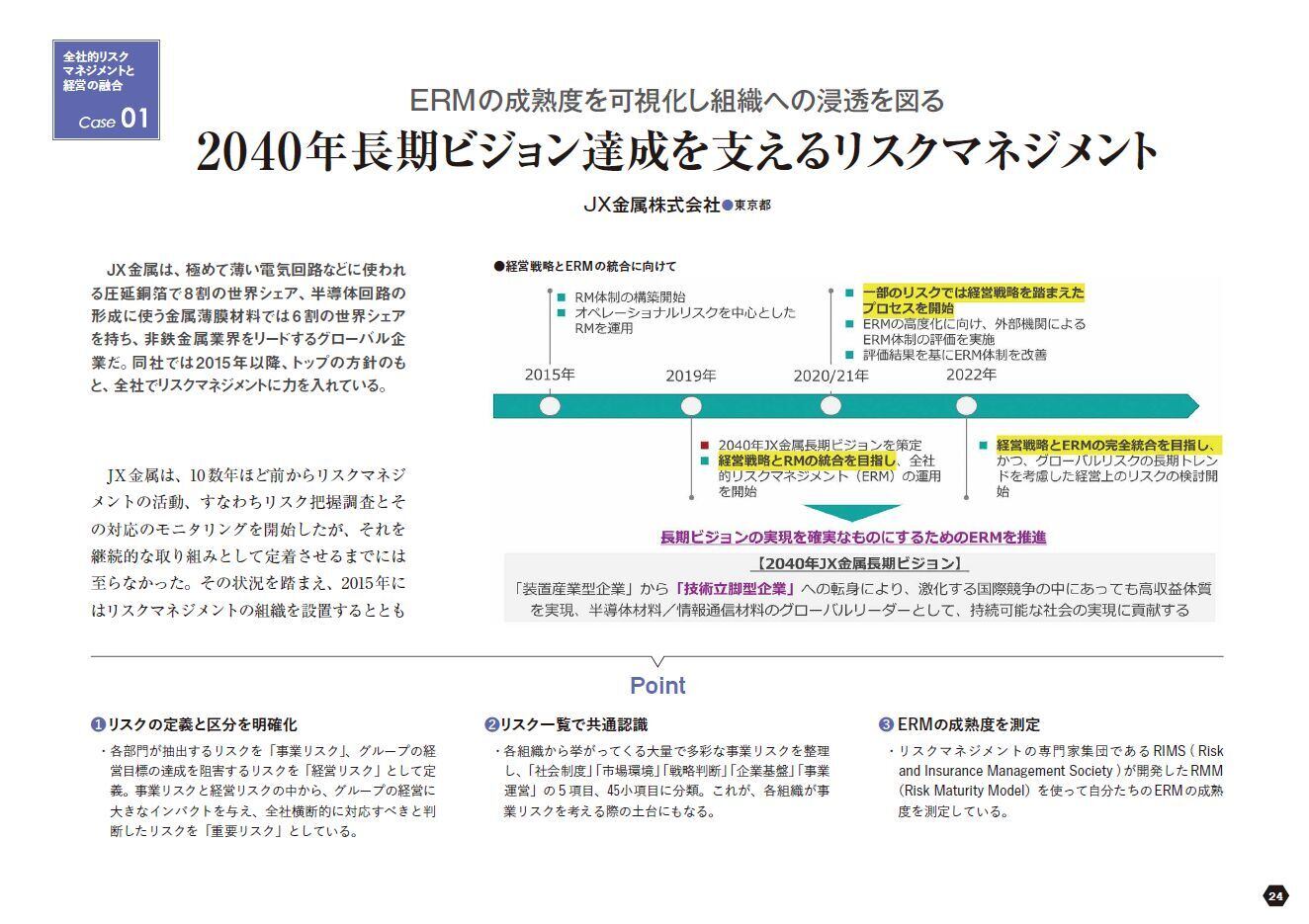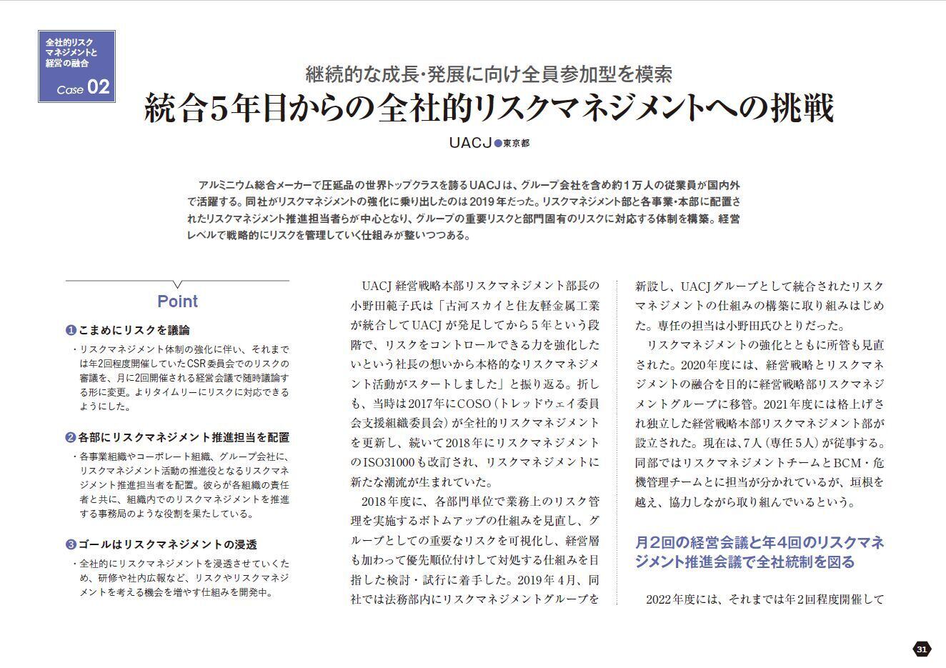 企業事例は前号に続き、全社的リスクマネジメント、ERMをピックアップ。経営戦略と融合させて取り組むことで、環境変化への適応性が高い柔軟な組織づくりを目指す取り組みを紹介します。