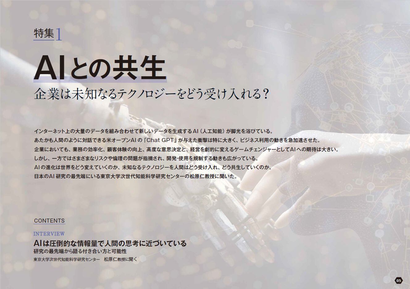 米オープンAI の「Chat GPT」を筆頭に、生成AIが脚光を浴びています。企業においても、経営改革の切り札としての期待が急浮上。しかし一方では、リスクや倫理の観点から規制の動きも広がっています。未知なるテクノロジーは世界をどう変えていくのか。第1特集ではAIの進化と可能性、共生のあり方を探ります。
