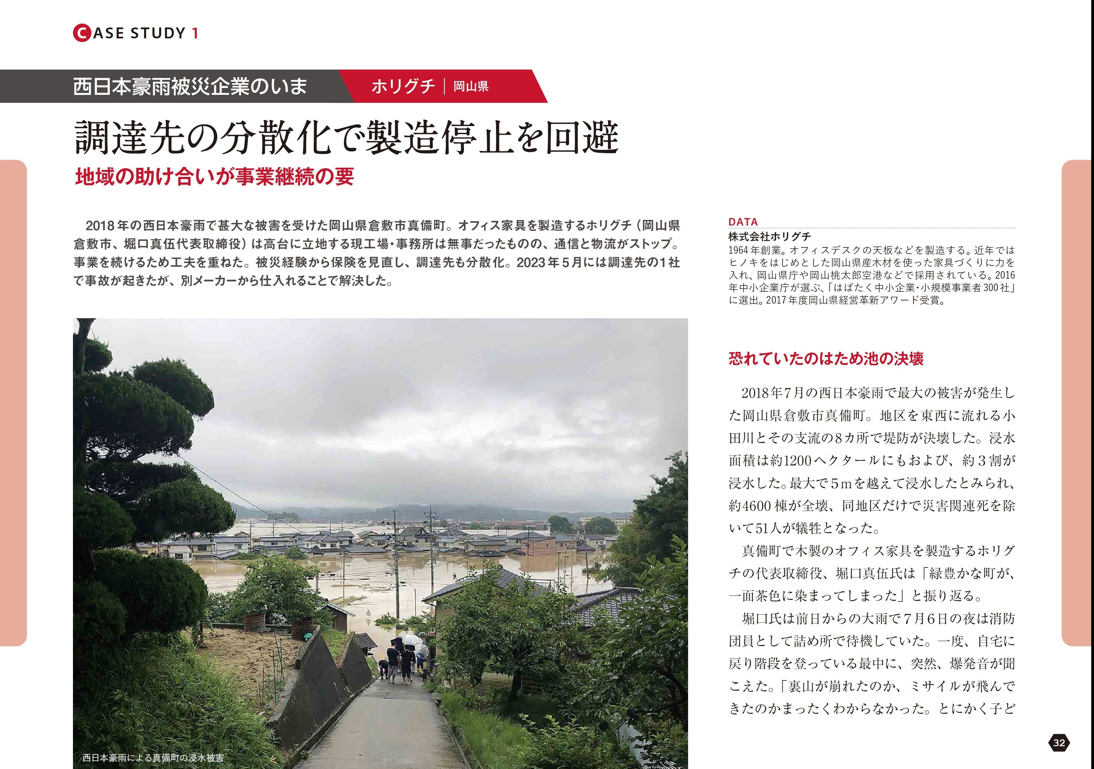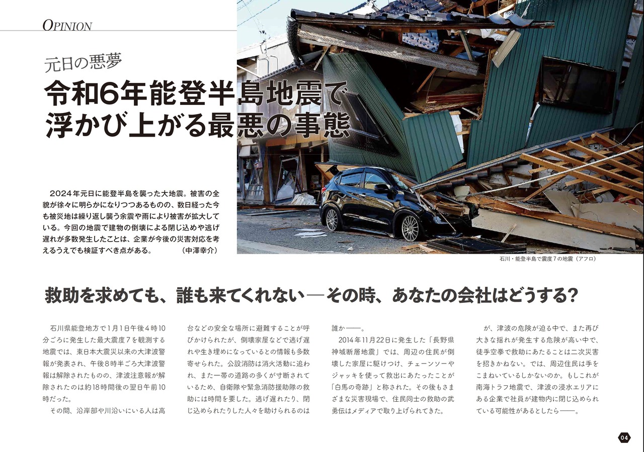 今号ではその力となるメッセージを、13人の専門家からいただきました(執筆はいずれも2023年12月時点)。また、独自調査では「南海トラフ地震臨時情報」に対する企業の意識と取り組み状況を分析。事例紹介では、2018年の西日本豪雨で大きな被害を受けた地元企業の復旧・復興の歩みを紹介しています。